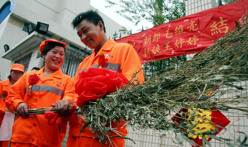 5月2日,新娘王婷婷在婚礼仪式上送给新郎毛维亮一把扫帚作为结婚信物。当日,一场简约独特的“保洁婚礼”在济南市市中区举行,工作服代替了婚纱,电动车代替了婚车,来自山东泗水的新郎毛维亮与来自山东平邑的新娘王婷婷,在他们共同负责保洁的街区喜结连理。