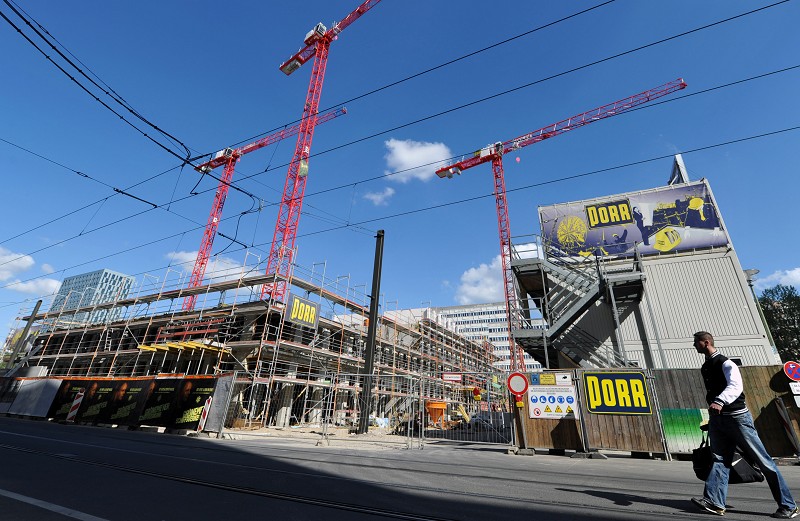 5月1日,一名行人经过德国柏林的一处建筑工地。德国在建筑、工程、护理以及酒店等领域技术人才缺口较大。从今年5月1日起,德国和奥地利向波兰、捷克、斯洛伐克、爱沙尼亚、拉脱维亚、立陶宛、匈牙利和斯洛文尼亚8国完全开放劳动力市场,此举有助于德国和奥地利弥补本国技术人员缺口和劳动力的不足。 (新华社发)