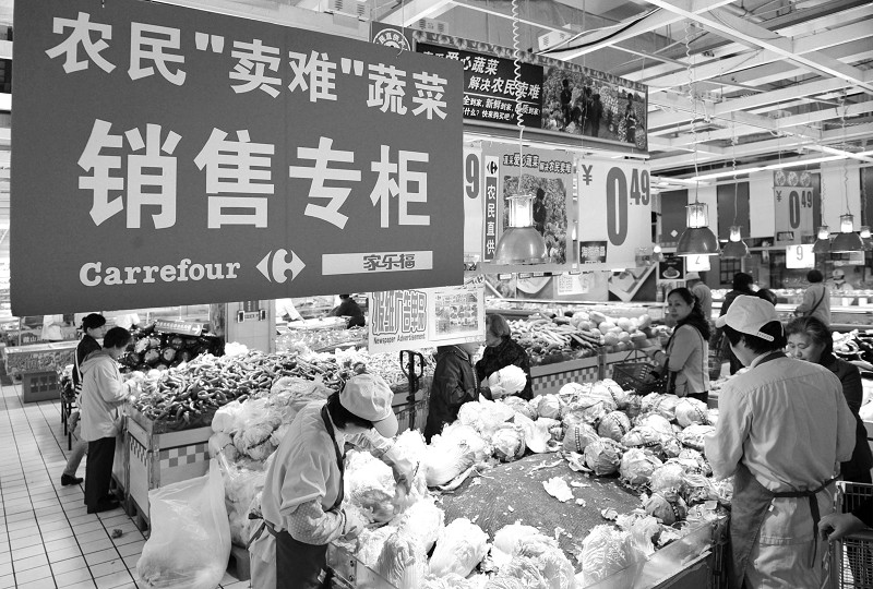5月6日,一超市工作人员在“卖难”蔬菜销售专柜整理蔬菜。近日,青岛市商务部门联合全市部分连锁超市,开辟农民“卖难”蔬菜销售专柜,通过“农超对接”,为农户及时发布蔬菜需求信息等方式,缓解菜农“卖菜难”的困境。 (新华社发)