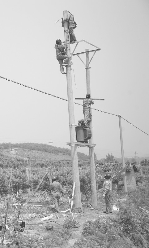 日前,在旱情严重的随县尚市镇太山村,当地供电所党员突击队正顶着烈日,加紧架设安装一台农业排灌泵站专变,以解决当地百姓生活和农业生产抽水用电问题。 (徐军国、郑义摄)