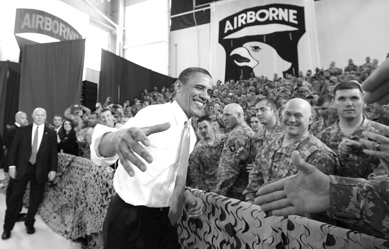 5月6日,美国总统奥巴马在肯塔基州坎贝尔堡军营看望士兵。奥巴马当天在肯塔基州坎贝尔堡军营闭门接见参与突袭“基地”组织领导人本·拉丹的美军特种部队士兵后发表电视直播讲话说,美国将按期从阿富汗开始撤军。 (新华社发)