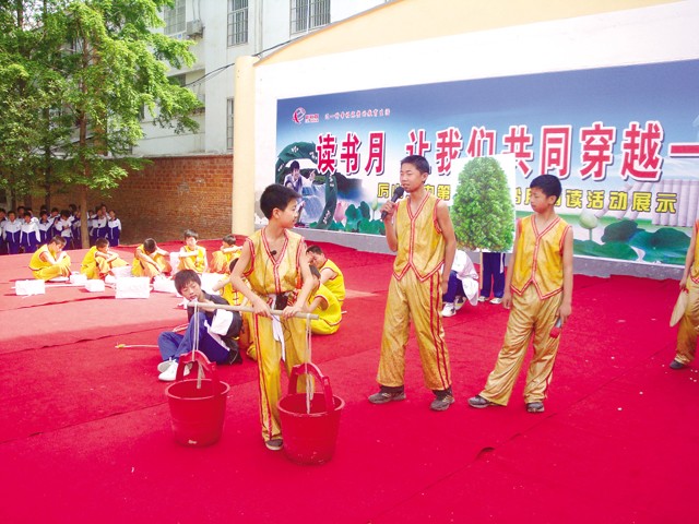 近日,随县厉山三中举行了以“让我们共同穿越一本书”为主题的读书月成果展示活动。图为展示活动上学生自编自演的课本剧《智取生辰纲》。(本报记者 陈云摄)