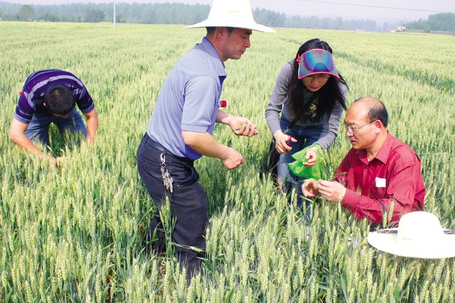 尽管遭遇冬季低温和秋、冬、春连旱,曾都区小麦万亩高产示范片由于推广了优良品种和机械条播、粉锈宁拌种、测土配方和统一化学除草、病虫害统防统治等集成技术,目前小麦长势稳健,依然丰收在望,预计亩产可达500公斤以上。图为农技人员近日在万店镇黄家畈村进行夏粮实测。(本报记者 采阳 通讯员 许贤超 摄)