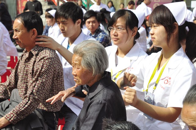 在“5·12”国际护士节这一天,市职业技术学院护理学院的学生走进舜井社区,为社区居民讲授家庭护理常识,开展护理义务服务。 (本报记者 陈德友 通讯员 陈立馗 摄)