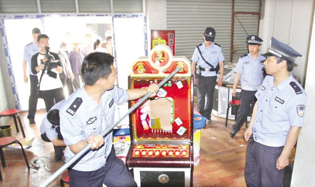 日前,随州经济开发区公安分局组织民警,对辖区内电玩娱乐场所涉及赌博游戏活动进行取缔,有效地打击了电玩城赌博之风,净化了社会环境。(本报记者杨闻名通讯员余贵生摄)