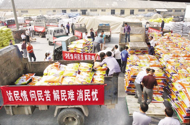 5月16日,随州经济开发区“三万”办组织各个驻村工作组为困难群众送化肥。当日,68吨化肥分别送到该区34个村,及时解决当前春播生产难题。图为组织车辆装运现场。 (本报记者 杨闻名 通讯员 王春艳摄)