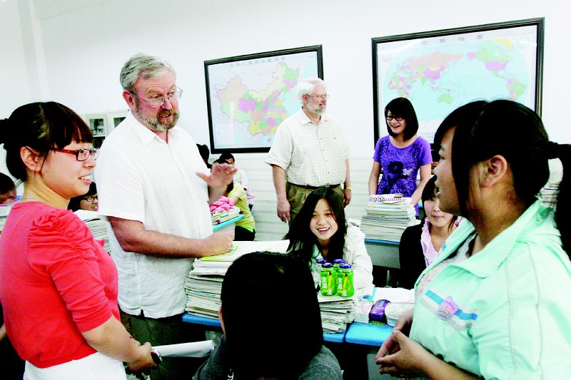 5月13日,美国托马斯杰弗逊中学访问团一行,来到随州外国语高级中学 (随州二中)访问交流。图为访问团成员与随州外国语高级中学学生交谈。(本报记者 张顺 通讯员 姜中启 摄)