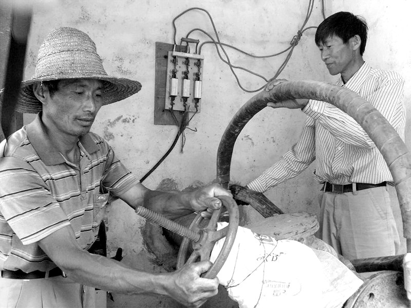 图4:5月15日,随县均川镇盛茂冲村八组水管员江明升(左)和村支部书记魏锦升正在检修村里的提水泵。抗旱以来,这个泵已经连续运转七昼夜,为全村1900亩水稻浇水抗旱。(本报记者 孙洪涛 李文军 杨闻名摄)