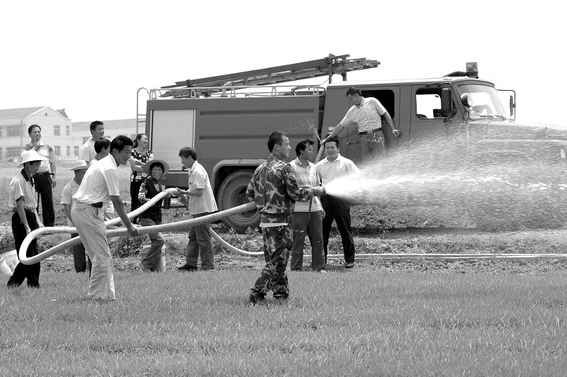 图1:5月16日,随县纪委联系湖北储备局270处,组织官兵用消防车运水帮助唐县镇福忠村移民为秧苗浇水抗旱。5月中旬,他们先后共为该村送去600余吨水,浇灌40余亩秧苗、110余亩金银花和20余亩麦田。(本报记者 孙洪涛 李文军 杨闻名摄)