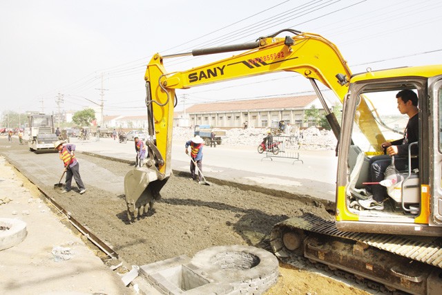 近日,市政管理处施工队在城区青年路东端加班加点改造道路。据悉,该路段改造工程全长一千三百多米,主干道两边各扩宽四点五米,改造后道路扩宽至二十一米,双向六车道,主干道全部刷黑,排水管道、强弱电线入地,工程预计七月中旬竣工。(本报记者 杨闻名 通讯员 王伦建 摄)