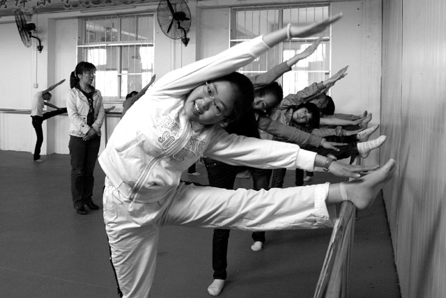曾都区何店中心学校不断大力投入,完善设施,建有钢琴室、舞蹈练功房、羽毛球馆等,为学生的全面发展创造了良好条件。图为学生们在老师的指导下训练舞蹈基本功。 (本报记者 张顺 通讯员 操明恒 摄)