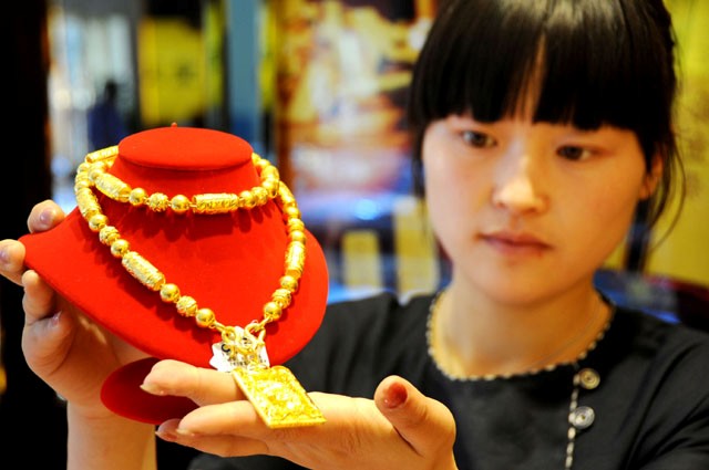 5月18日,江苏连云港一金店的工作人员在展示黄金项链。受到美元持续走强以及索罗斯大笔抛售黄金等利空因素的打压,纽约商品交易所黄金期货价格17日大幅下挫,跌至近五周以来的最低水平。 (新华社发)