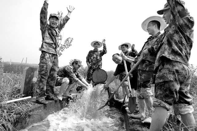 随县环潭镇黄林村位于涢水河边,但由于河水水位下降、河道淤塞,泵站取水口抽不到水。5月19日,随县人武部组织环潭镇40余名民兵来到该村,从水河中开渠引水到泵站取水口。“水抽上来了!”经过两个多小时的奋战,水渠疏通了,泵站终于抽出水了,民兵们欢呼起来,该村沿河1200亩稻田可以栽上秧了。(本报记者 李文军 摄)