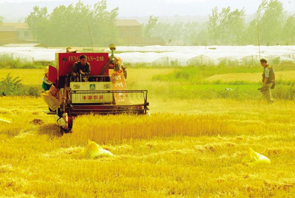 ▲曾都区万店镇农民日前正收割成熟的小麦。据介绍,全区大面积收割即将开始。(本报记者孙洪涛摄)