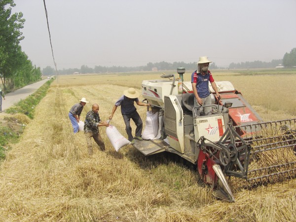 ▲20日上午,随县安居镇漂河村夏粮正式开镰了!该村今年又添置了一台小型联合收割机,加上原有的两台和外来的机收队,2500多亩小麦有望实现机械化收割。图为市“三万”活动工作组帮助农民抢收夏粮。 (本报记者邱学锋 陈 玉摄)