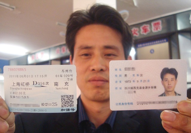 5月22日,在苏州人民路的火车票代售点,一名旅客展示刚购买的动车实名制车票及身份证。6月1日起,全国动车组列车将实行购票实名制。5月22日全国各大火车站及火车票代售点开始发售6月1日动车组列车车票。 (新华社发)