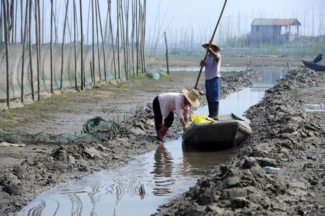 5月27日,一只渔船在湖底临时挖出的河沟里艰难前进。持续高温无雨,洪湖正遭遇70年一遇的特大干旱,降水量与往年相比减少七成,水位低落,湖水最深处只有30多厘米。 (新华社发)