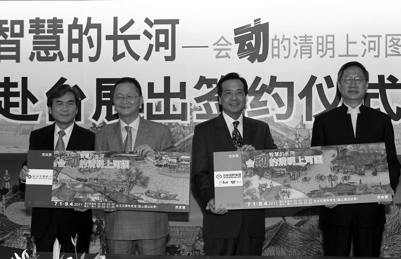 5月28日,2010年上海世博会中国馆“智慧的长河——《清明上河图》”赴台湾展出签约仪式在上海世博局举行。据悉,今年7月1日至9月4日,电子动态版《清明上河图》将以“智慧的长河——会‘动’的《清明上河图》”为名赴台北展出。 (新华社发)