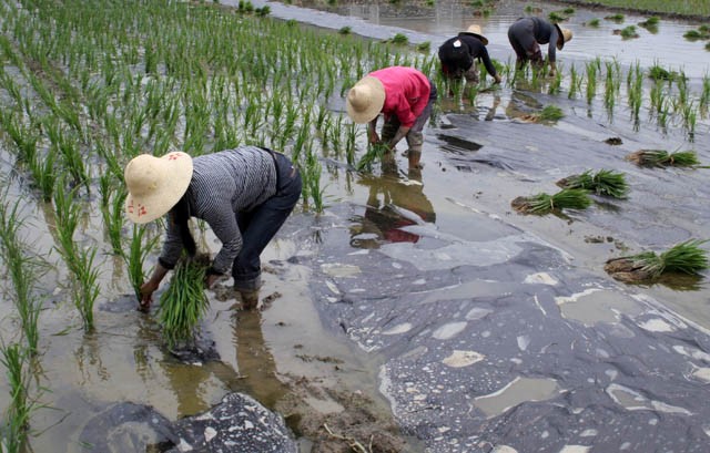今年以来,湖北竹溪县遭遇冬春夏连旱。为保证水稻不错过插秧季节,当地有关部门在调配抗旱设备、引水灌溉的同时,组织农技工作人员及时指导农民推广水稻“直播节水种植法”。按照这种种植方法,农民们需先将稻田翻整碎土,施有机肥,然后在地表覆盖地膜,最后打孔、点种,在田里灌水保潮,水稻就可发芽、生长。也可在覆盖了地膜并灌水后的稻田直接插秧。采用这种种植方法,可以节水、省时、省工,其用的地膜是可氧化降解膜,不会对土地造成污染。图为湖北竹溪县中峰镇邓家坝村民在覆盖着地膜的水稻田里插秧。 (新华社发)
