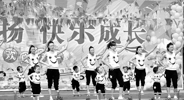 5月28日,随县均川中心幼儿园举办了以“童心飞扬,快乐成长”为主题的庆六一文艺汇演。孩子们通过合唱、舞蹈等形式迎接自己的节日,充分展现了健康、活泼、向上的精神风貌。图为小朋友和家长同台表演《相亲相爱在一起》亲子操。 (李晓红 陈华 摄)