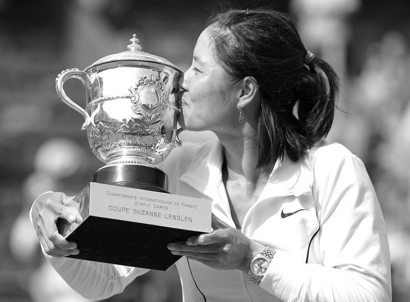 6月4日,李娜在颁奖仪式上亲吻奖杯。一路过关斩将的中国网球领军人物李娜法国当地时间4日下午直落两盘赢得法网决赛,成为第一个捧起大满贯赛单打奖杯的亚洲人。亚洲“一姐”李娜的世界排名从第七跃居第四,平了日本名将伊达公子创造的亚洲最高排名。(新华社发)