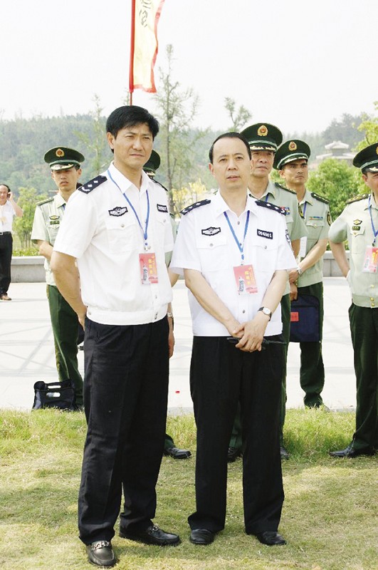 省公安厅副厅长赵飞(左一)与市委常委、政法委书记、公安局长万学斌现场指导安保工作