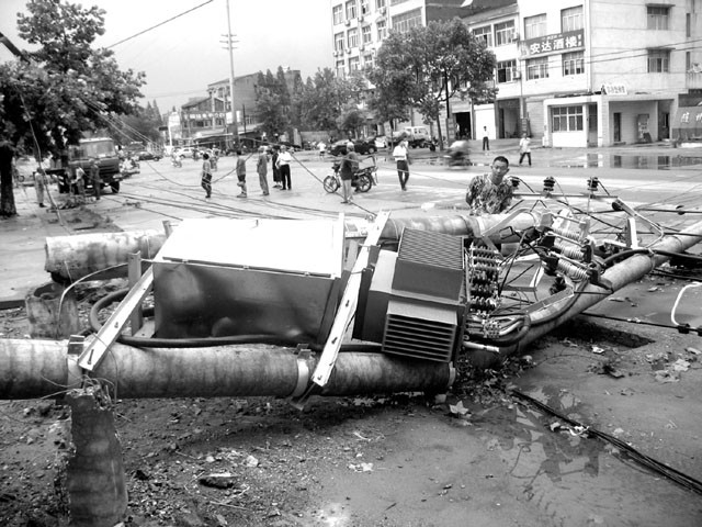 左上图:昨日下午两点左右,位于曾都区南郊柳树淌社区附近路段十一根电线杆被大风刮断,受损严重。随州市供电公司迅速调动九十余名电力工人及机械设备准备冒雨连夜现场抢修,争取尽快恢复通电。