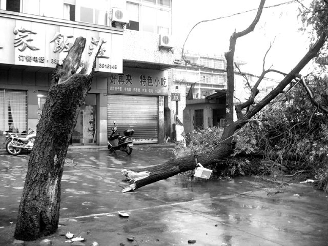 左下图:位于南郊卫生院对面的一棵大树被大风刮断。