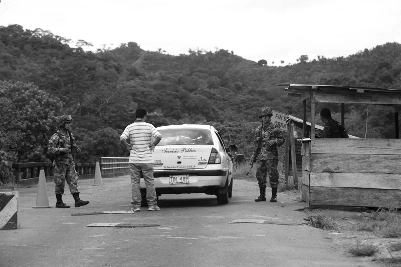 图为6月10日,在哥伦比亚南部卡格达省首府的公路上,全副武装的哥陆军士兵在公路哨位上检查过往车辆和人员。