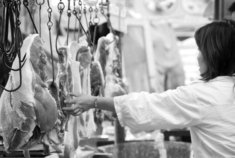 6月14日,市民在青岛一农贸市场购买猪肉。