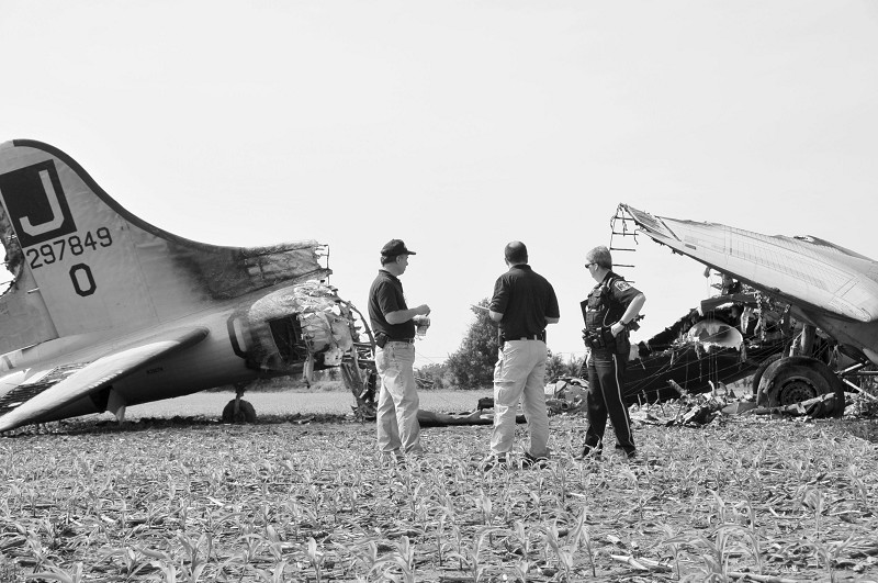 这是6月13日在美国芝加哥西部的奥罗拉机场附近拍摄的坠毁的轰炸机。这架B-17老式轰炸机当天在芝加哥西部的奥罗拉机场起飞后不久因引擎起火而坠毁,机上7人全部成功逃生。 (新华社发)