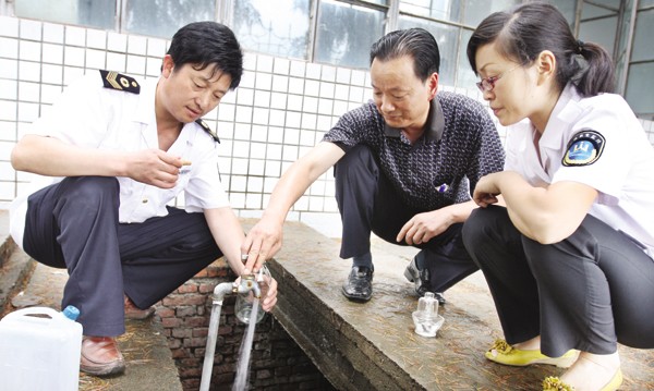 6月14日,市卫生监督局执法人员在玉龙供水公司水河水厂对出厂水进行抽检监测。为保障市民生活饮用水水质卫生安全,市卫生监督局组织专班人员,加大执法力度,对全市供水单位的水源水、出厂水、管网末梢水及二次供水单位进行不定期的抽检。(本报记者 杨闻名摄 通讯员 梅仁波 文)
