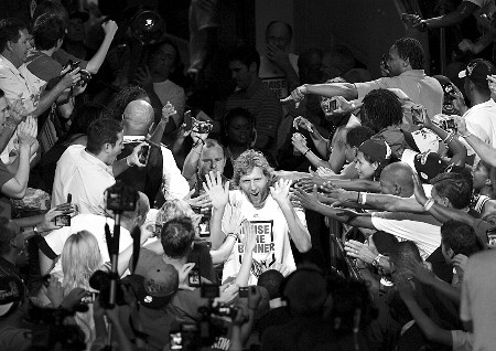 沿街前行所到之处不少球迷齐声高喊“Let’sGoMavs”,而美航中心的广场上,大屏幕给到诺维茨基时,球迷更是一片沸腾,“MVP”不绝于耳。诺维茨基和基德还在花车上模仿特里招牌动作“飞翔”的样子,引得球迷一片尖叫。