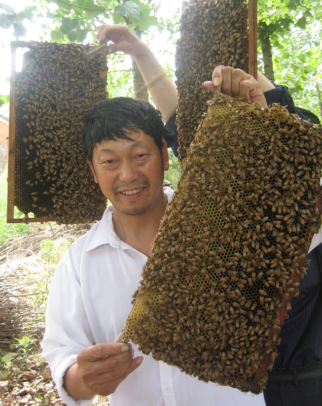 6月16日,随县养蜂合作社社长李运学在养殖基地展示他养殖的蜜蜂。据了解,该社已经吸纳农民养蜂社员20余人,养蜂笼数达到4000笼以上。(本报记者 杨闻名 通讯员 叶超 摄)