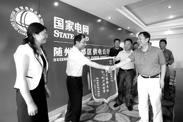 情系三农解民忧,“三万”到户办实事。六月二十三日,随县新街河源店村民将锦旗送到市政法委和曾都区供电公司,以感谢他们对村级发展的大力支持。(本报记者 孙洪涛 摄)