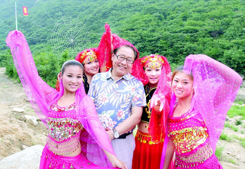 图为马德华(中)与演艺员工扮演的”蜘蛛精“们在西游记公园蜘蛛洞景点前。 (杨闻名摄)