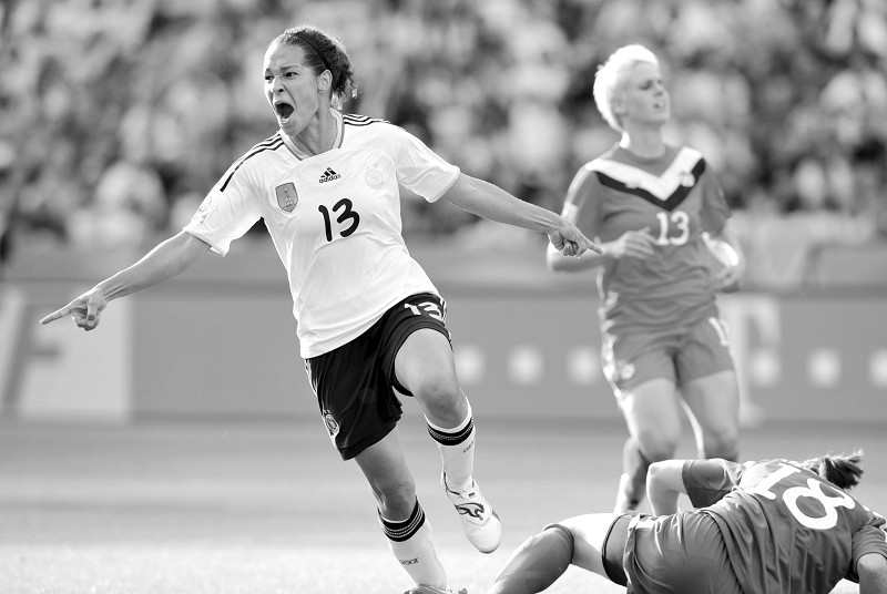 6月26日,德国队球员姆巴比(左)在打入本队第二粒进球后庆祝。当日,2011年德国女足世界杯赛在柏林奥林匹克体育场开幕。在揭幕战中,卫冕冠军德国队以2:1战胜加拿大队。 (新华社发)