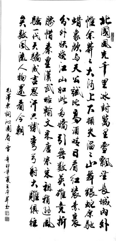 江山如此多娇,引无数英雄竞折腰。惜秦皇汉武,略输文采;唐宗宋祖,稍逊风骚。一代天骄,成吉思汗,只识弯弓射大雕。俱往矣,数风流人物,还看今朝。