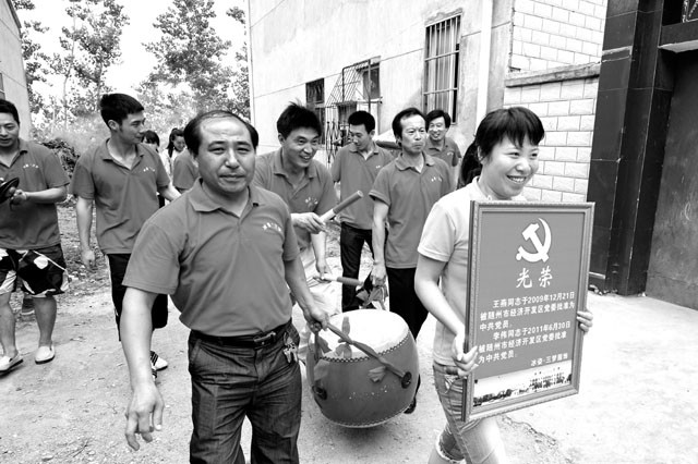 7月1日,冰姿·三梦服饰公司举行优秀党员表彰会和新党员入党仪式后,公司总经理、党支部书记韩继雄带领公司党支部委员将 “优秀党员”、“党员”匾牌送到优秀党员和新党员家中,以增强党员的荣誉感、责任感和使命感,使其以优秀的业绩喜迎党的九十华诞。