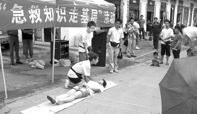 7月7日,湖北医药学院大学生来到曾都区洛阳镇中心广场开展“急救知识走基层”暑期社会实践活动,向广大农民群众讲解心肺复苏、梗塞处理、农药中毒急救等基本急救知识,深受当地群众欢迎。 (本报记者 杨闻名 通讯员 胡兵 摄)