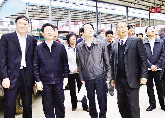 图一:中国农业银行党委书记、董事长项俊波(右三)在省市领导陪同下到三里岗香菇交易市场视察