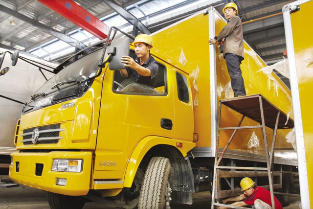 七月四日,湖北程力专用汽车有限公司特种厢式车厂生产车间,工人正在加班生产销往深圳大运会赛事现场专用应急抢险车。据悉,该厂近日生产的流动舞台车开进了环青海湖国际公路自行车赛开幕式现场。(本报记者 杨闻名 通讯员 黄军 摄)