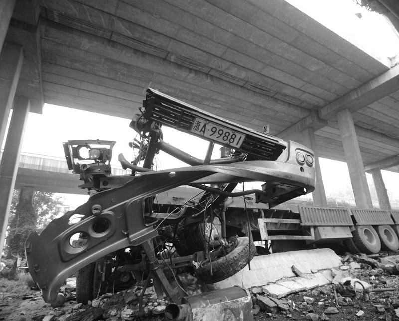 记者在现场看到,出事桥面距离钱塘江江面有几百米的距离。桥面主道边缘长达二十多米、一米多宽的桥面已经塌落,桥侧边挡板也已经没有了,桥面出现一个较大的缺口,出事货车的挂车部分已经严重变形,翻倒在下匝道上,卡进桥面缺口的车头已经被吊机吊离现场。