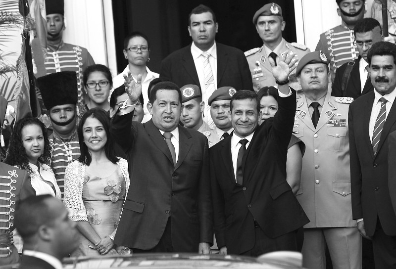 7月15日,在委内瑞拉首都加拉加斯,委内瑞拉总统乌戈·查韦斯(前左)在总统府会见秘鲁当选总统奥良塔·乌马拉(前右)。
