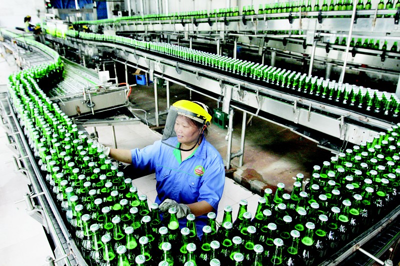 七月十五日,青岛啤酒(随州)有限公司包装车间一片繁忙景象。开年来,公司调整产品结构,主打“青岛”品牌赢得市场,优化先进的工艺流程,更新配套设施,销量顺应市场持续攀升,截至六月底,产销量比去年同期增长百分之十,利润增长百分之十五,上缴税收增长百分之十六。(本报记者 杨闻名 摄)