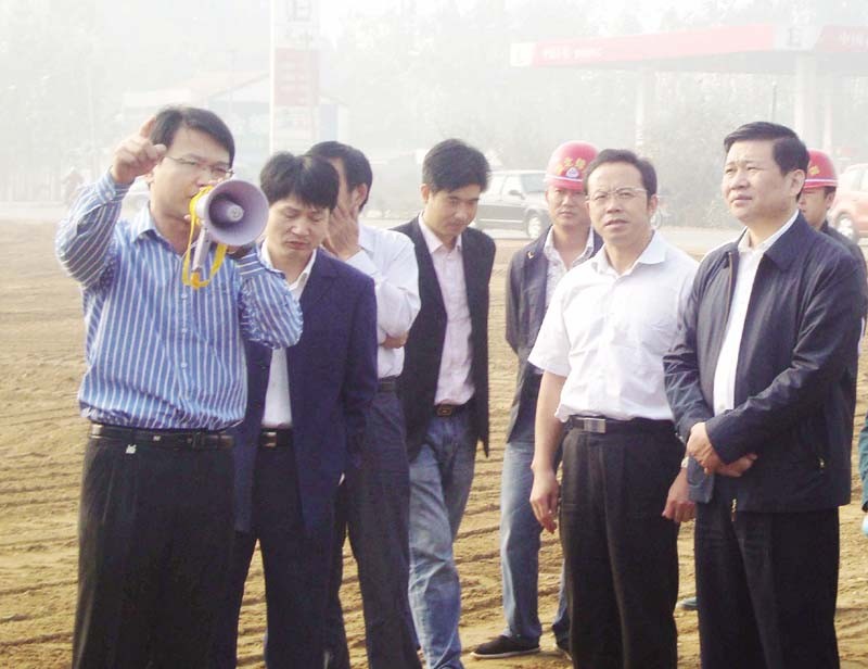 市委书记王祥喜(右一)在随县县委书记、县长陈德贵(右二)的陪同下在随州经济开发区调研,听取开发区党工委书记任超(左一)情况汇报。