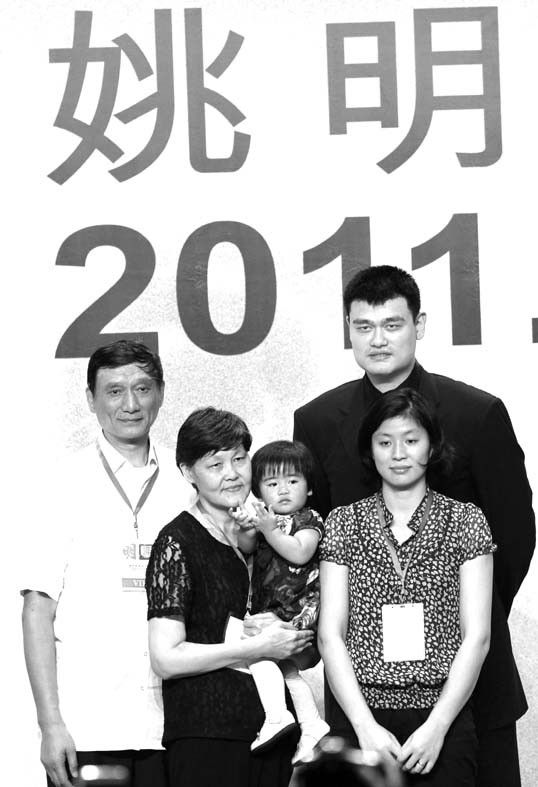 姚明(右上)和父亲姚志源(左一)、母亲方凤娣(左二)、女儿姚沁蕾(中)、妻子叶莉在新闻发布会上。