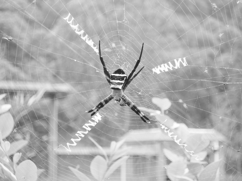 近日,在曾都区洛阳镇一家饭店门前的树上,一只蜘蛛“写”出了英文字母“W、N”等,引来当地居民看稀奇。 (徐军国、汪敏 摄)