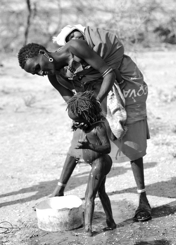 7月22日,在肯尼亚北部伊西奥洛地区的桑布鲁族聚居地区,一名母亲用水给孩子清洗身体。2010年以来,非洲之角地区遭遇数十年不遇的大旱,多国宣布进入干旱灾害状态。 (新华社发)