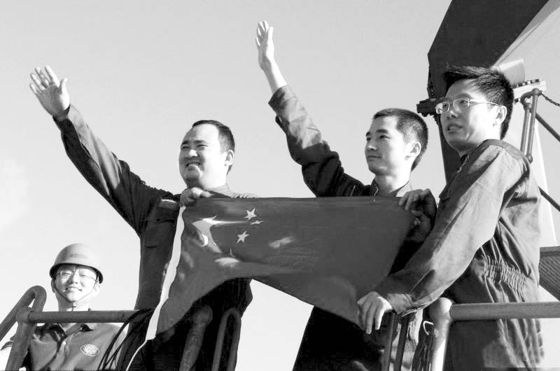 图为:叶聪、杨波、付文韬在下潜成功返回后展示国旗。·新华社发·